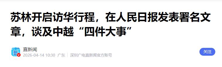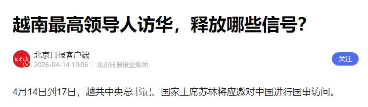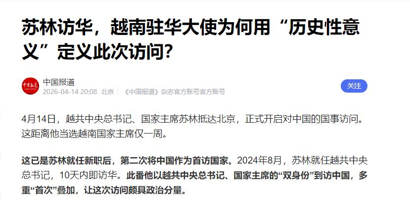新华网4月14日报道,越南国家主席苏林抵达北京,开启为期四天的国事访问,这是他当选后首次出访,首站就选中国,足见对中越关系的重视,同日,俄罗斯外交部正式官宣,外长拉夫罗夫将访华,重点协商中东局势。